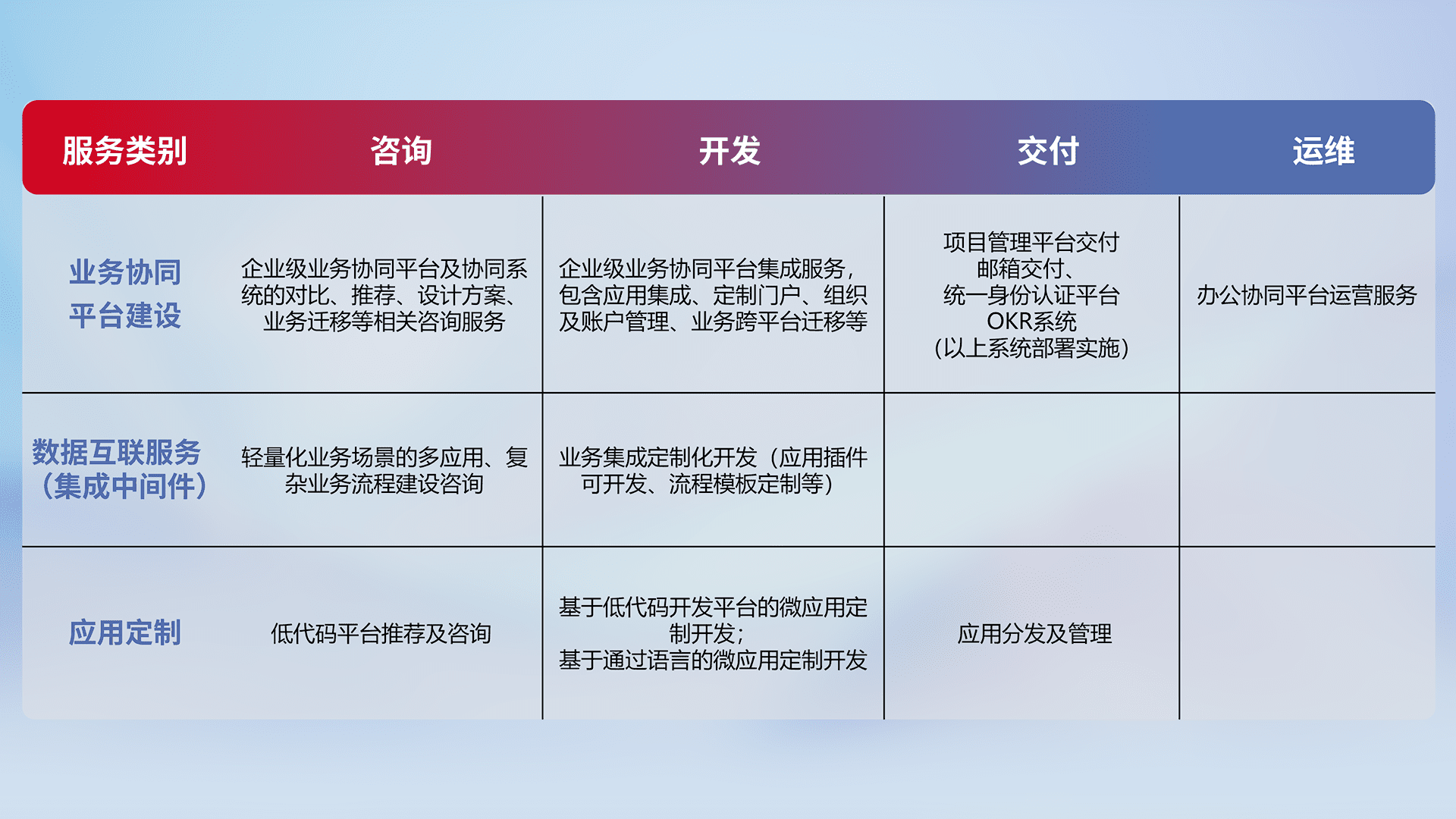 针对钉钉、、企微、、IDaas等平台级产品提供产品的规划、、方案、、、、交付、、、、定制化开发等服务,,实现如统一协同办公、、、智能客户服务、、混合会议管理、、、、智能数据查询、、、、等业务场景,,,实现数字化转型。。