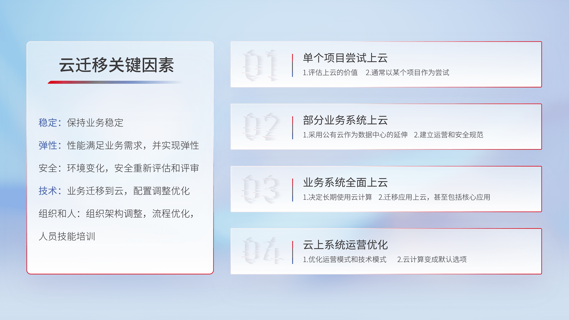 结合实际业务,,,,从规划设计、、、、云平台选型、、、云原生改造、、、、数据迁移、、、集成交付,,,,迁移全过程为客户识别最佳上云路径,,,做好风险识别管理,,,设计网络架构、、、、身份权限、、、、安全审计合规、、、操作审计、、、日志审计、、监控告警策略、、、多站点容灾设计等,,,对云上基础设施进行整体规划,,,,提升IT治理水平,,,以满足弹性、、、、高可用、、、、高性能的需求。。。