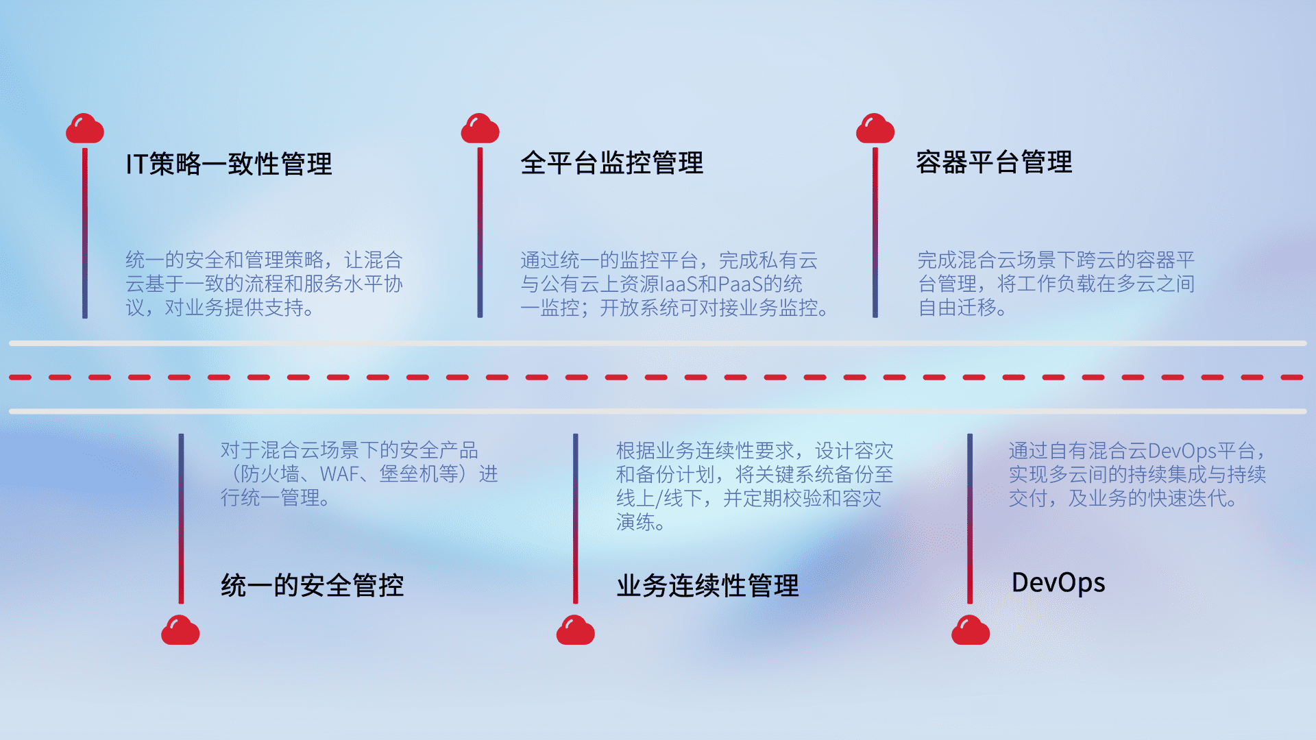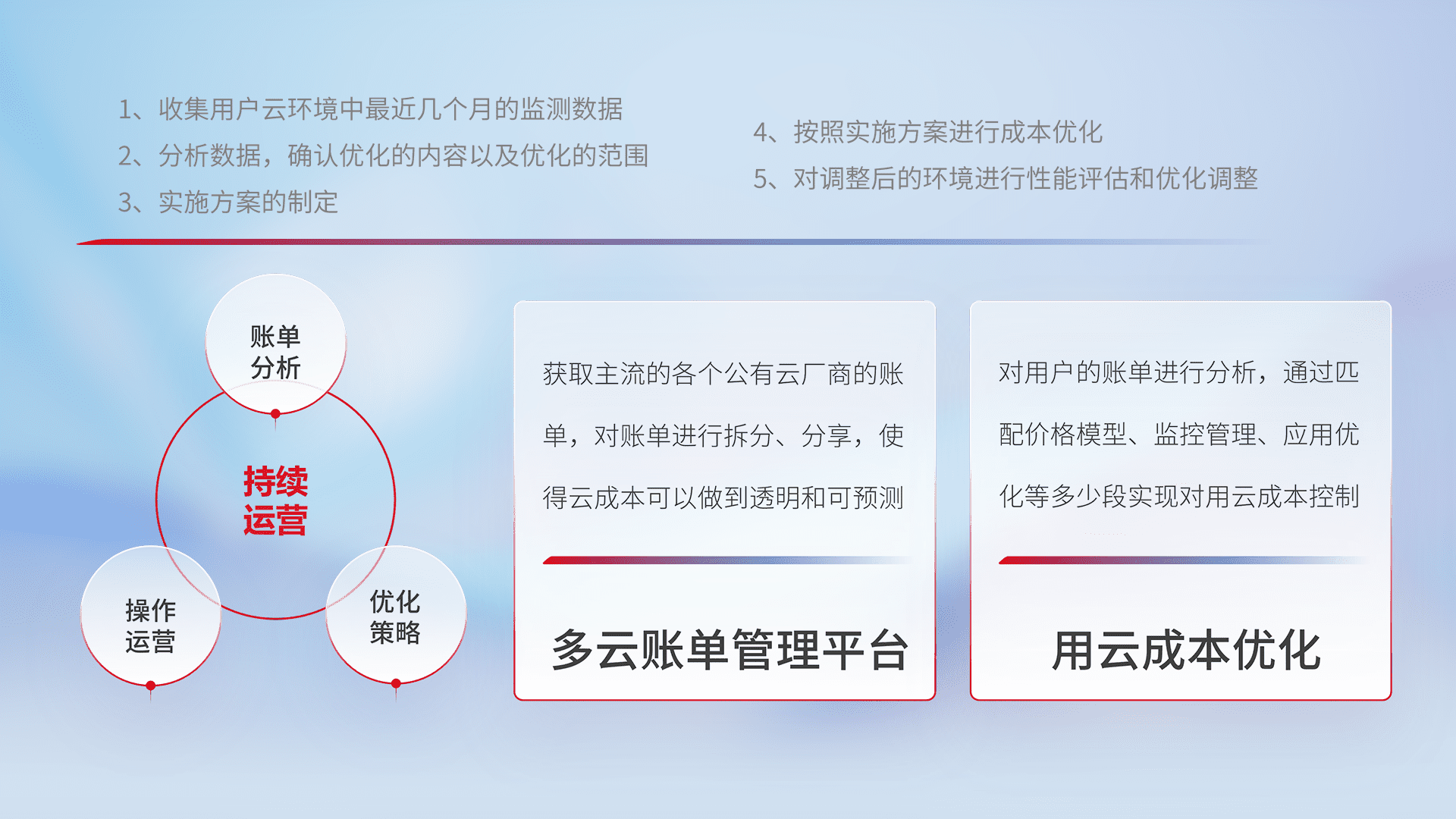 通过多云纳管,,以统一的资源数据模型把客户的云资源进行抽象和封装,,,,进而实现对多云资源的统一操作,,保障云资源管理的可靠性、、、稳定性与可用性。。。。量身定制化运维内容,,配置、、、、开发运维、、、、补丁管理、、、备份、、监控、、、、认证和访问管理、、审计和日常巡检等,,,,保障在用云过程中的可靠度,,,稳定度以及高可用率。。。
