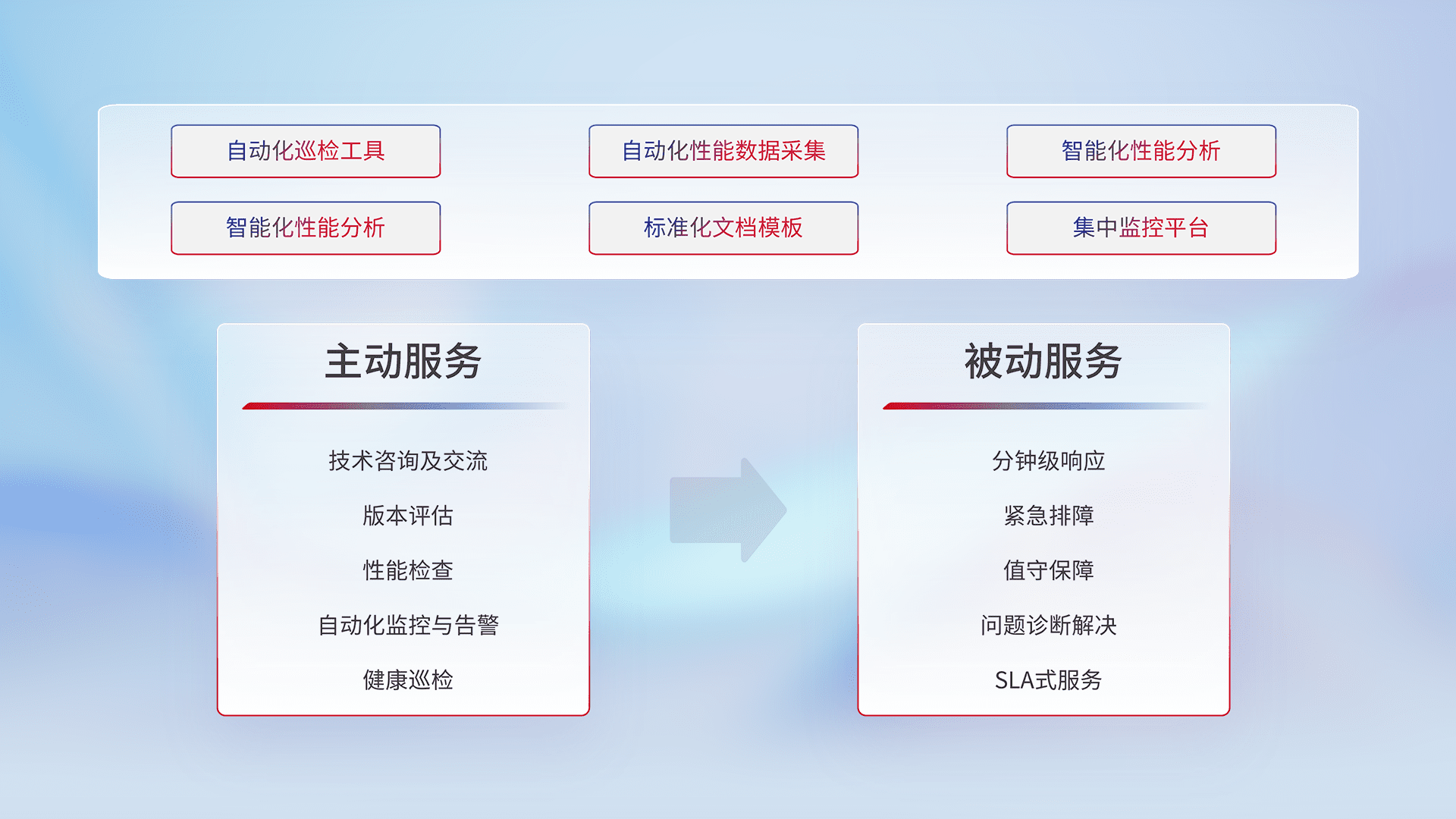 智能化工具和标准化文档,,,保障服务质量,,,,提供主动服务(包含技术咨询、、版本评估、、、性能检查、、、自动化监控与告警、、、健康巡检)和被动服务包含(分钟级响应、、、紧急排障、、、、值守保障、、、问题诊断解决、、、、SLA服务)。。。