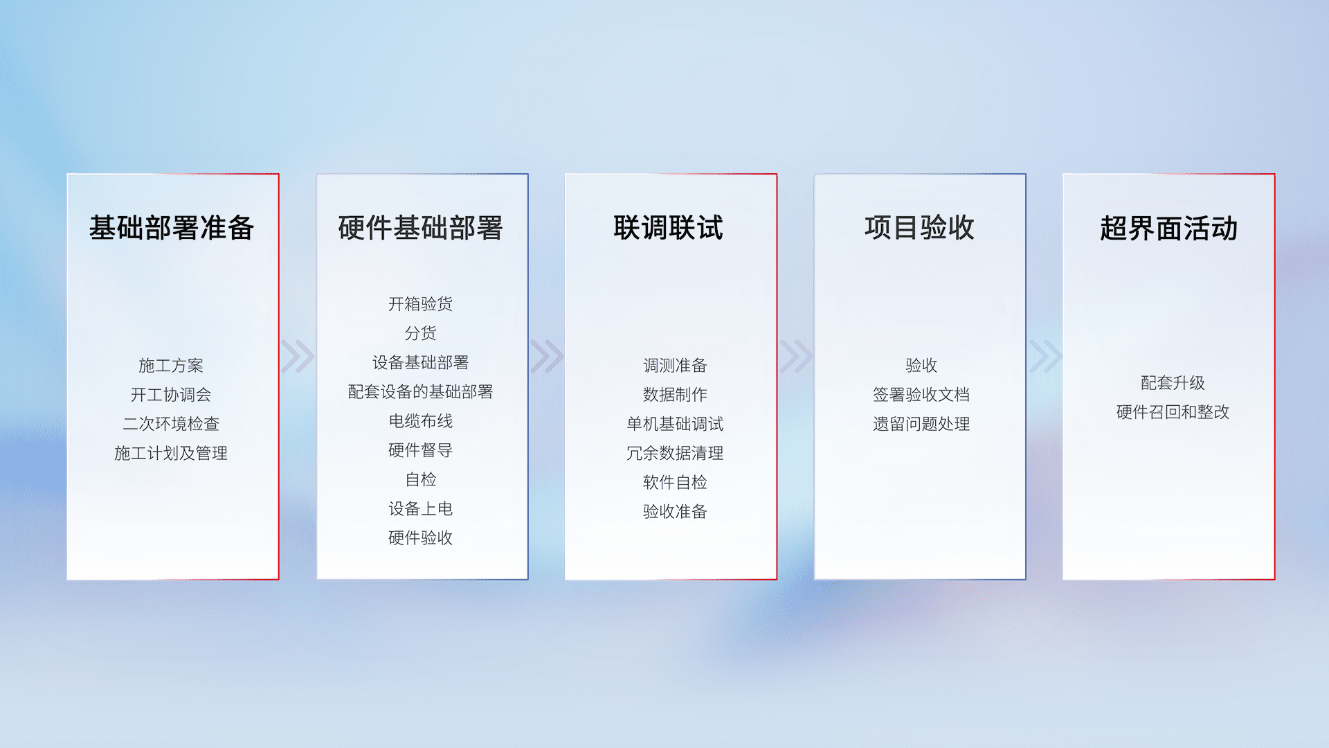 从基础部署准备、、、硬件基础部署、、联调联试、、、项目验收、、越界面活动的全过程可追溯,,,保证施工质量和进度。。。
